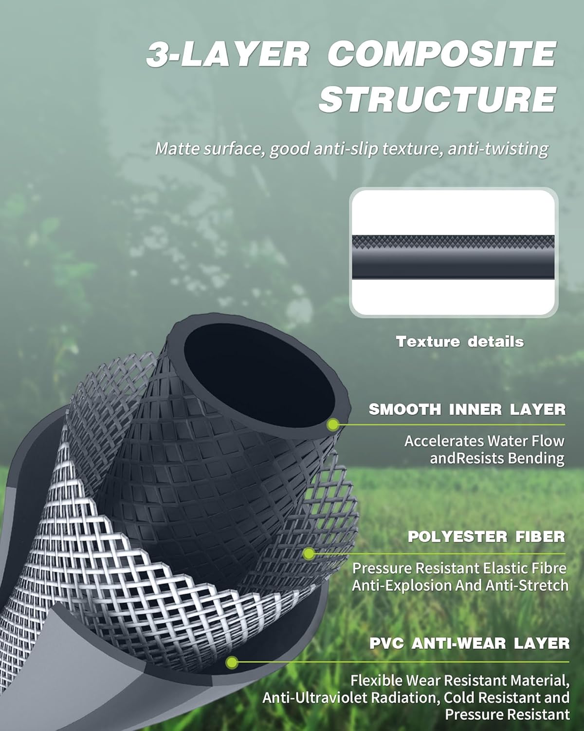 - High-Quality Hose: This can handle up to 120 psi working pressure and 348 psi burst pressure, with a brass hose connector to prevent cracking or leaking. The internal support mesh also has superior kink resistance