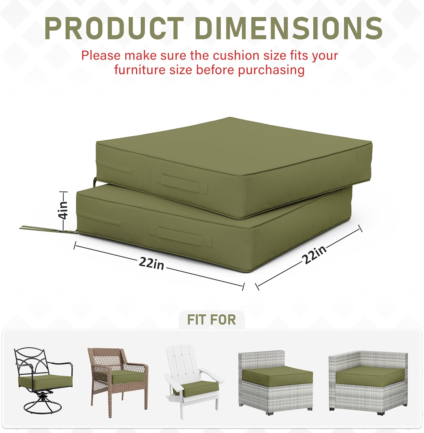 - π About Size - The Tounosnt Double Seat Cushion Set package includes 2 outdoor chair cushions (22β L x 22β W x 4β H). Please measure your seating area. The correct size is essential for enhancing your comfort and overall aesthetic.
