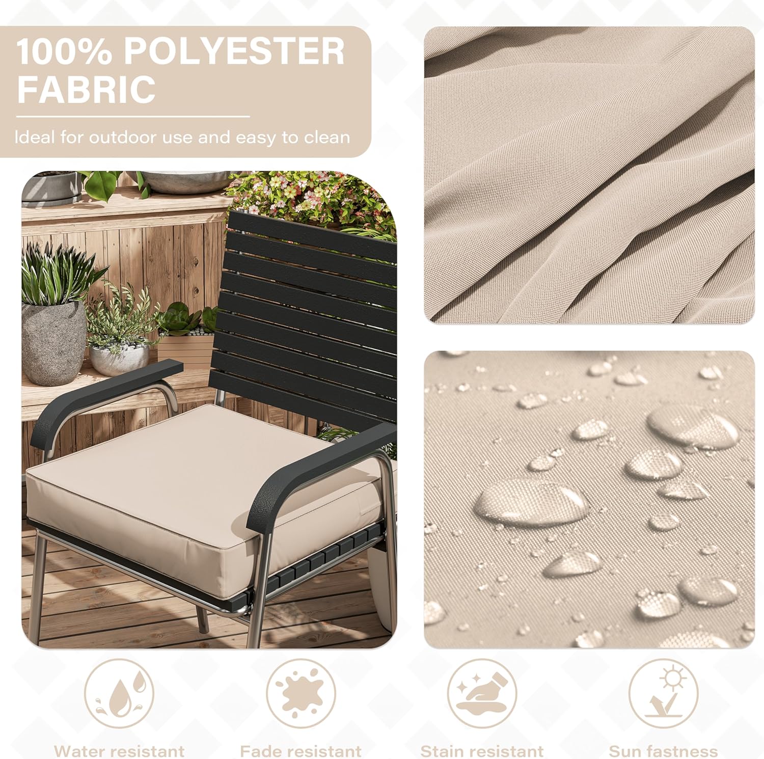 - π WEATHERPROOF - The Patio Furniture Chair Cushion is made of double-layer waterproof coated fabric that is waterproof on all sides, keeping the rain out and keeping the foam dry and tidy. Even in bad weather, it looks brand new with just a little care from you!