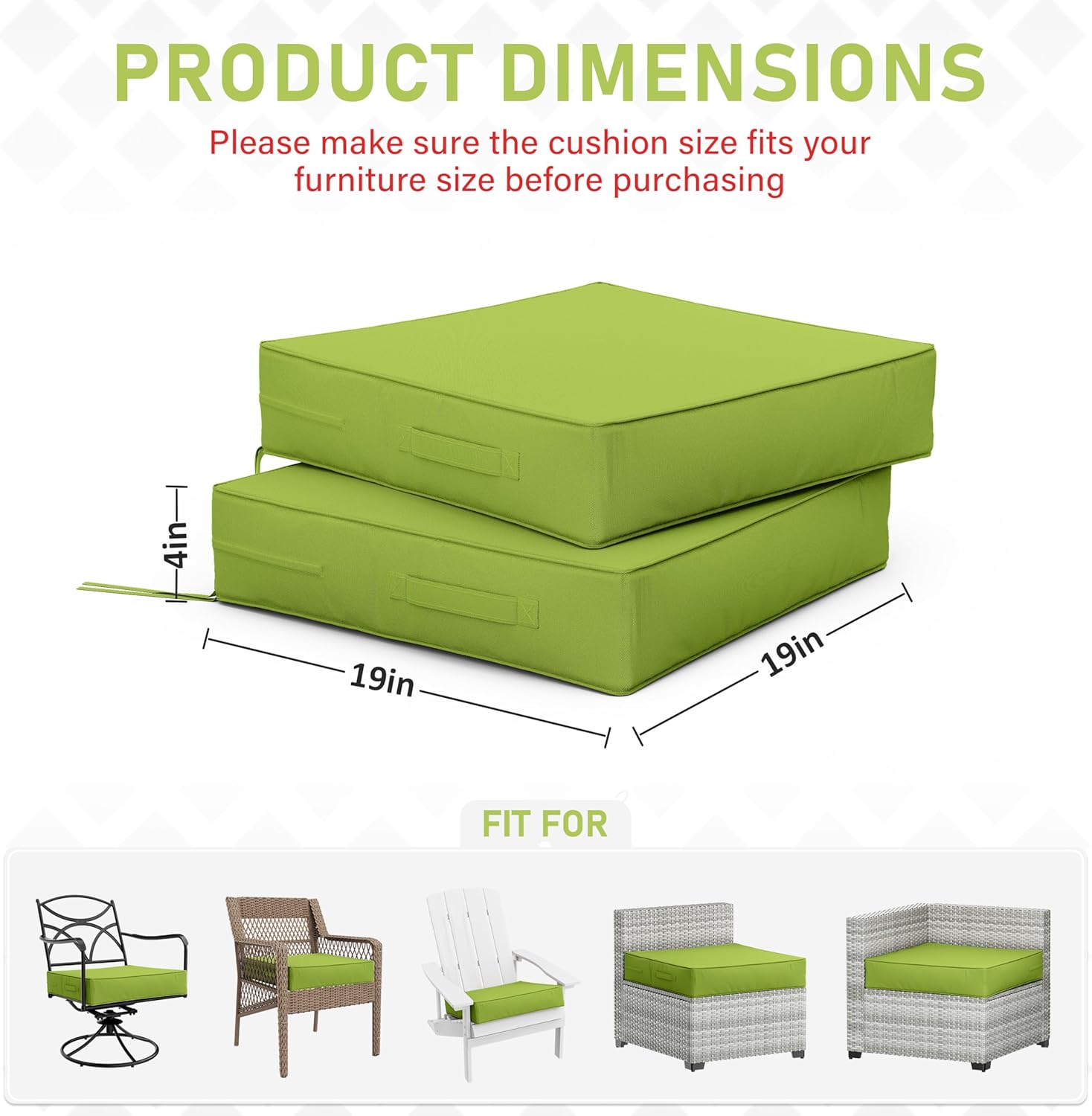 Patio Chair Cushions 19 X 19 X 4 Inch Waterproof Outdoor Seat Cushions for Patio Furniture, Outdoor Sofa Couch Pads with Ties & Handle, Set of 2, Grass Green