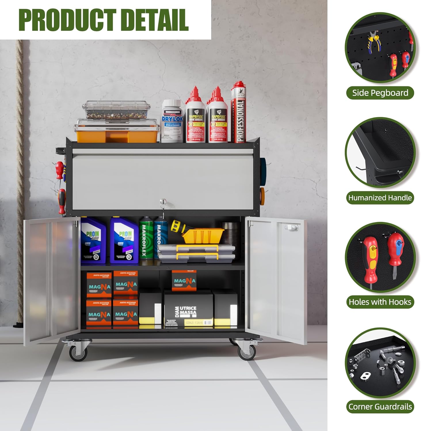 Metal Storage Cabinet on Wheels with 1 Drawer, Rolling Steel Garage Tools Cabinet with Side Pegboard &4 Hooks & 1 Adjustable Shelf for Garage,Shop,Home,Gray/Black, Assembly Required