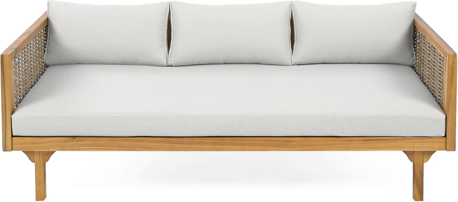 Christopher Knight Home Outdoor 3 Seater Acacia Wood Daybed with Fabric Water Resistant and Removable Cushions, Patio Garden Sofa with Wicker Armrest and Slat Paneling Back, Teak and Light Grey