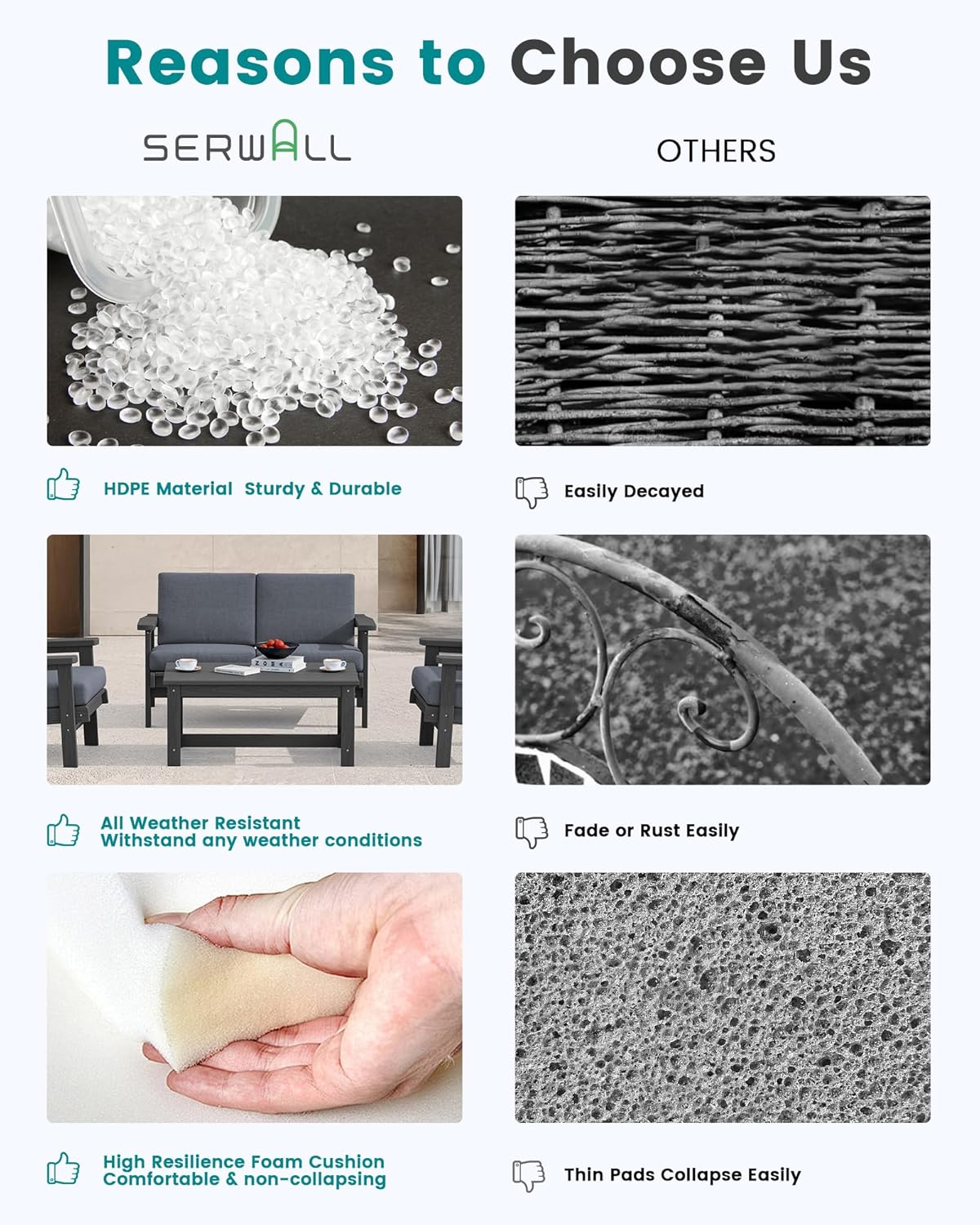 - After-sales Support: We want our customers to be 100% satisfied with serwall outdoor furniture - you can always come to us for any product questions and product care, we are committed to your satisfaction.