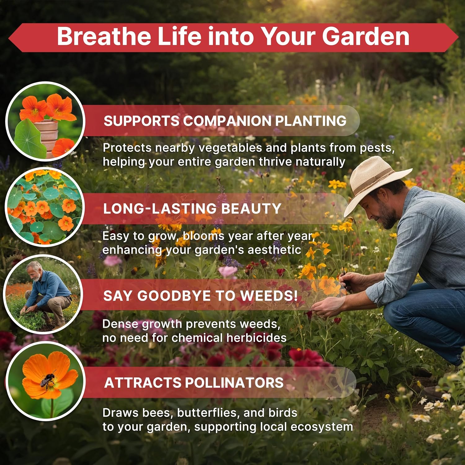 - High Germination Rate - Grow beautiful nasturtium flowers effortlessly, whether in indoor trays or your backyard garden. Our premium seeds boast a superior germination rate, rigorously tested to ensure successful growth year-round. Perfect for creating vibrant blooms in your own garden, these top-quality seeds are also a thoughtful gift for gardening enthusiasts.