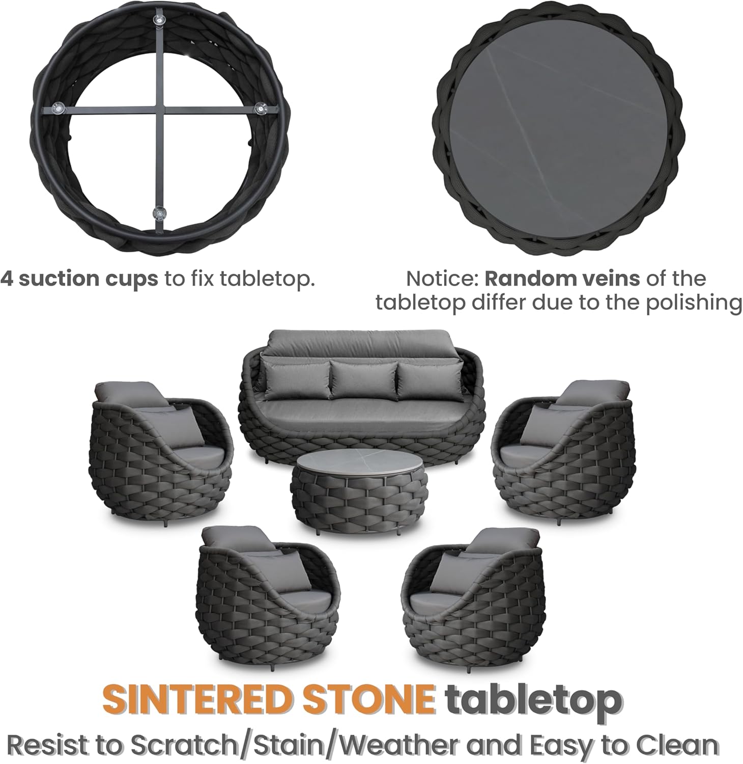 6 Pieces Rope Patio Furniture Set: Aluminum Outdoor Couch Set Cushioned - Assembled Porch Conversation Sofa Set Modern - Metal Patio Seating for 7 Person Deck Garden Poolside Hotel, Dark Gray