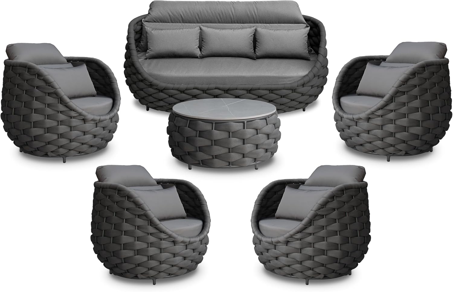 - Furniture set is crafted from reinforced rust-free aluminum alloy frame, wrapped in hand woven polyester rope. The 6 pieces all weather patio upholstered conversation set resists to UV, rain, wind, salt water. Perfect for indoor outdoor even arid or coastal areas