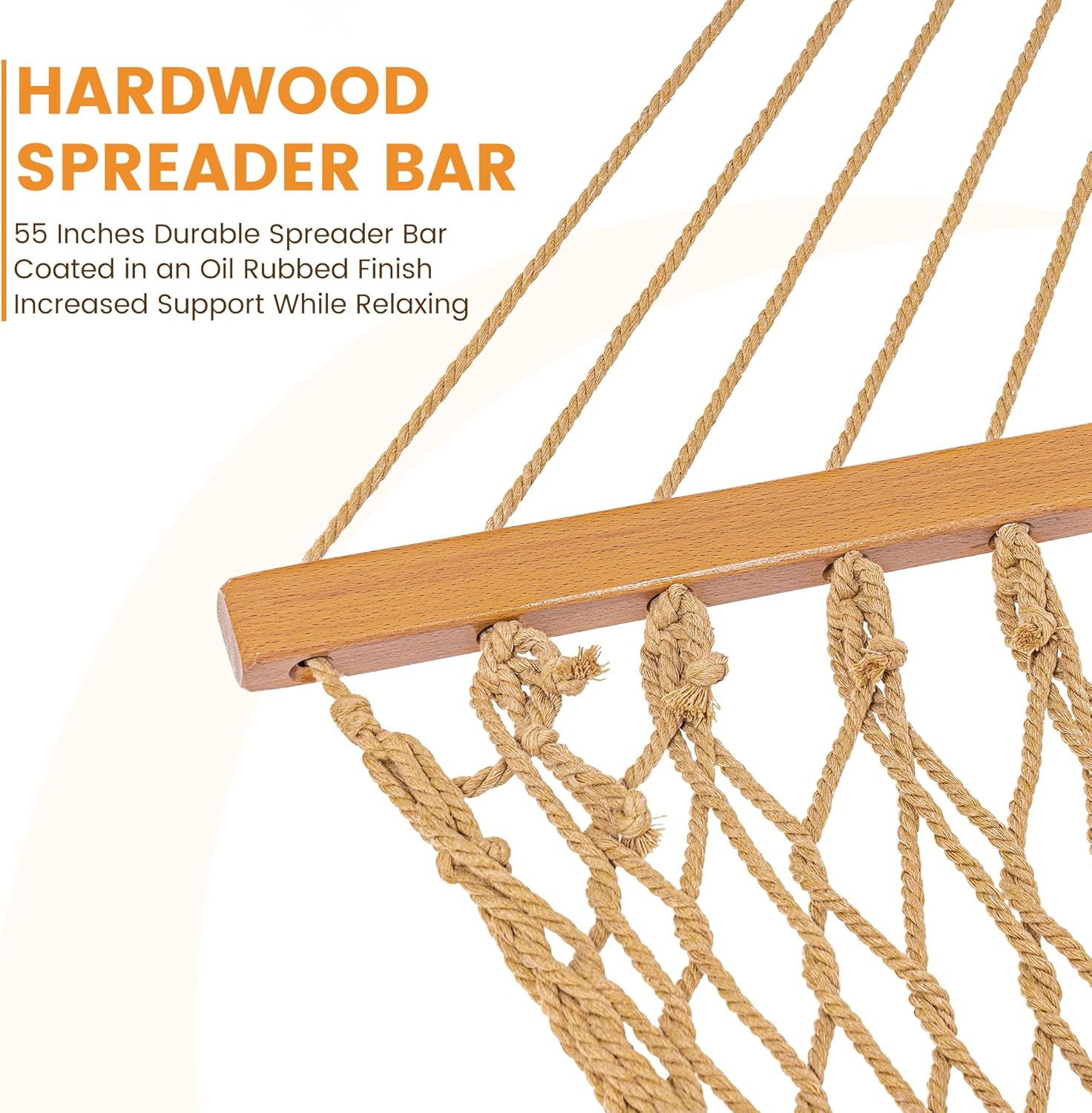Lazy Daze Hammocks Double Rope Hammock, 2 Person Traditional Outdoor Hand Woven Cotton Rope Hammock with Spreader Bar, Chains, Tree Straps for Patio Yard - Max 450 Lbs, Tan