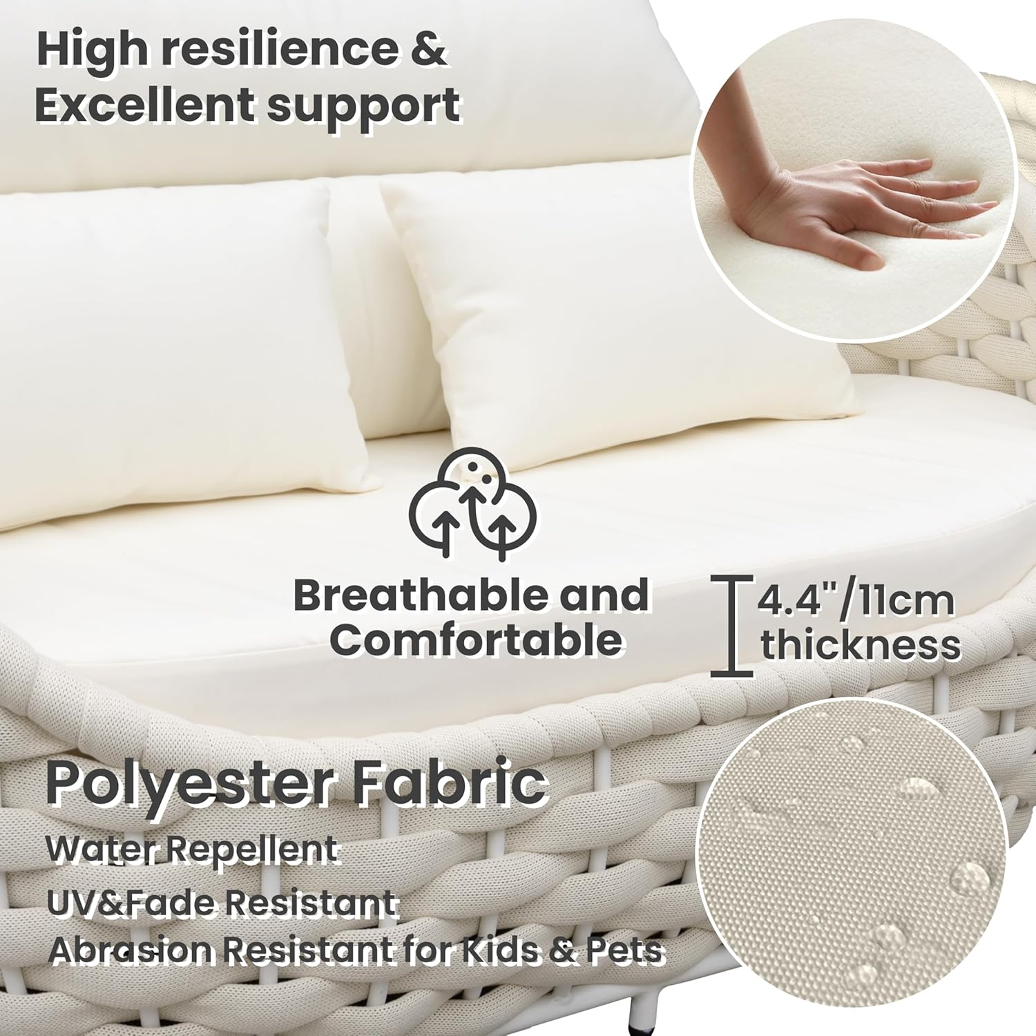 - Filled with 4.3"/11cm thick high-density sponge and cotton, cushions are soft touching and breathable for a refresh comfy patio seating holding its shape in long time using. Water repellent and abrasion resistant polyester fabric also fits families with kids and pets