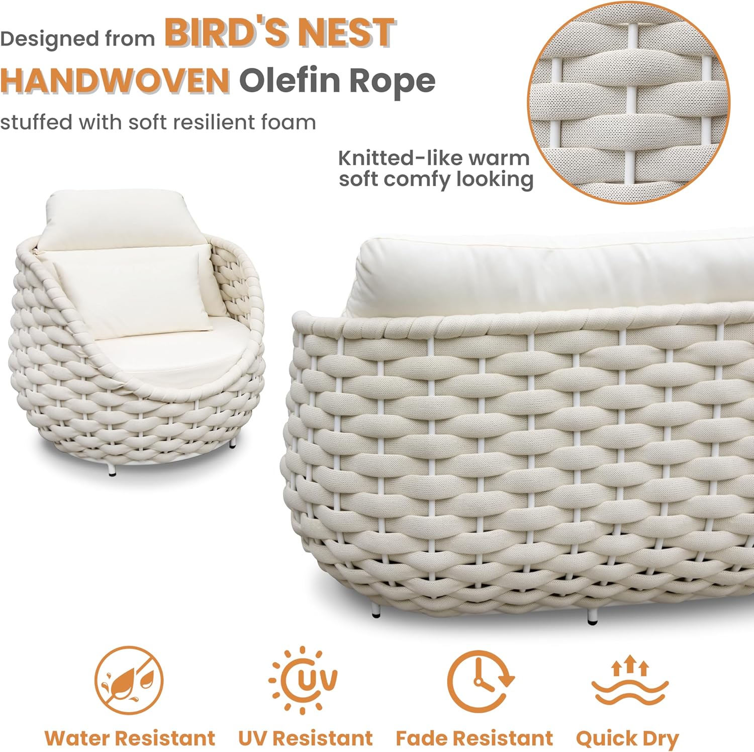 - Inspired by bird's nest shape, the Erotr assembled cushioned sofa set for 4 person combines comfort, elegance and durability. Knitted-like ropes give a warm comfy looking. Curved scoop armrest, supportive backrest and deep cushioning offer an enveloping ultimate relaxation