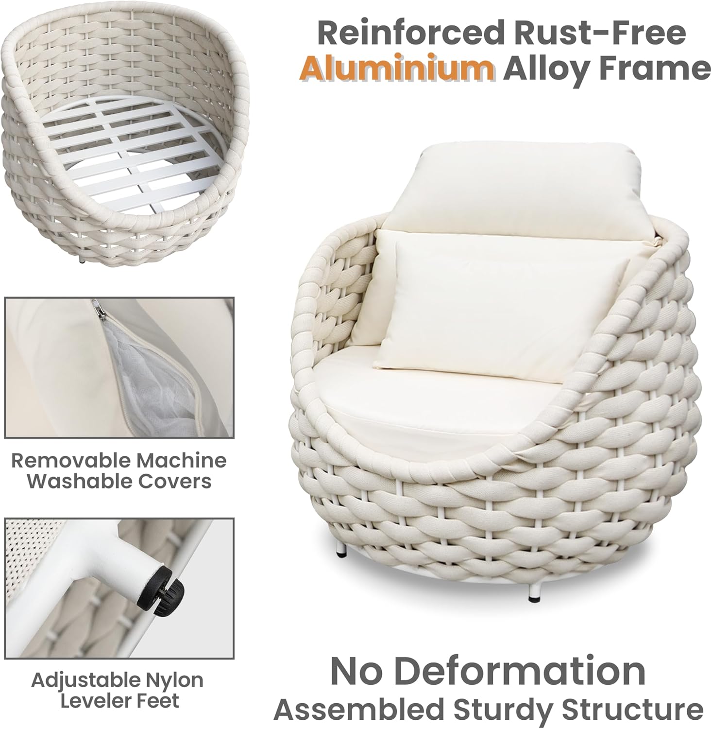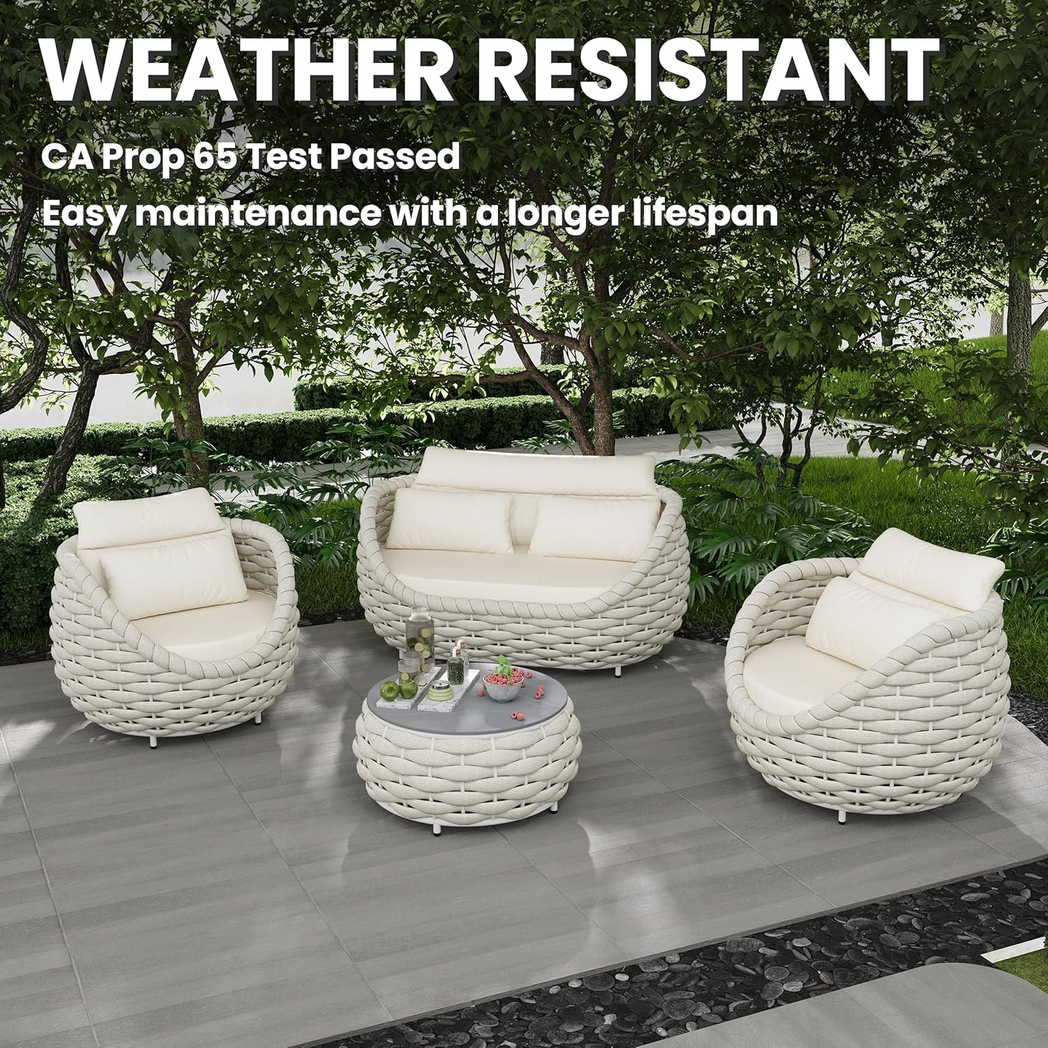 - Furniture set is crafted from reinforced rust-free aluminum alloy frame, wrapped in hand woven Olefin rope. The 4 pieces all weather patio upholstered conversation set resists to UV, rain, wind, salt water. Perfect for indoor outdoor even arid or coastal areas