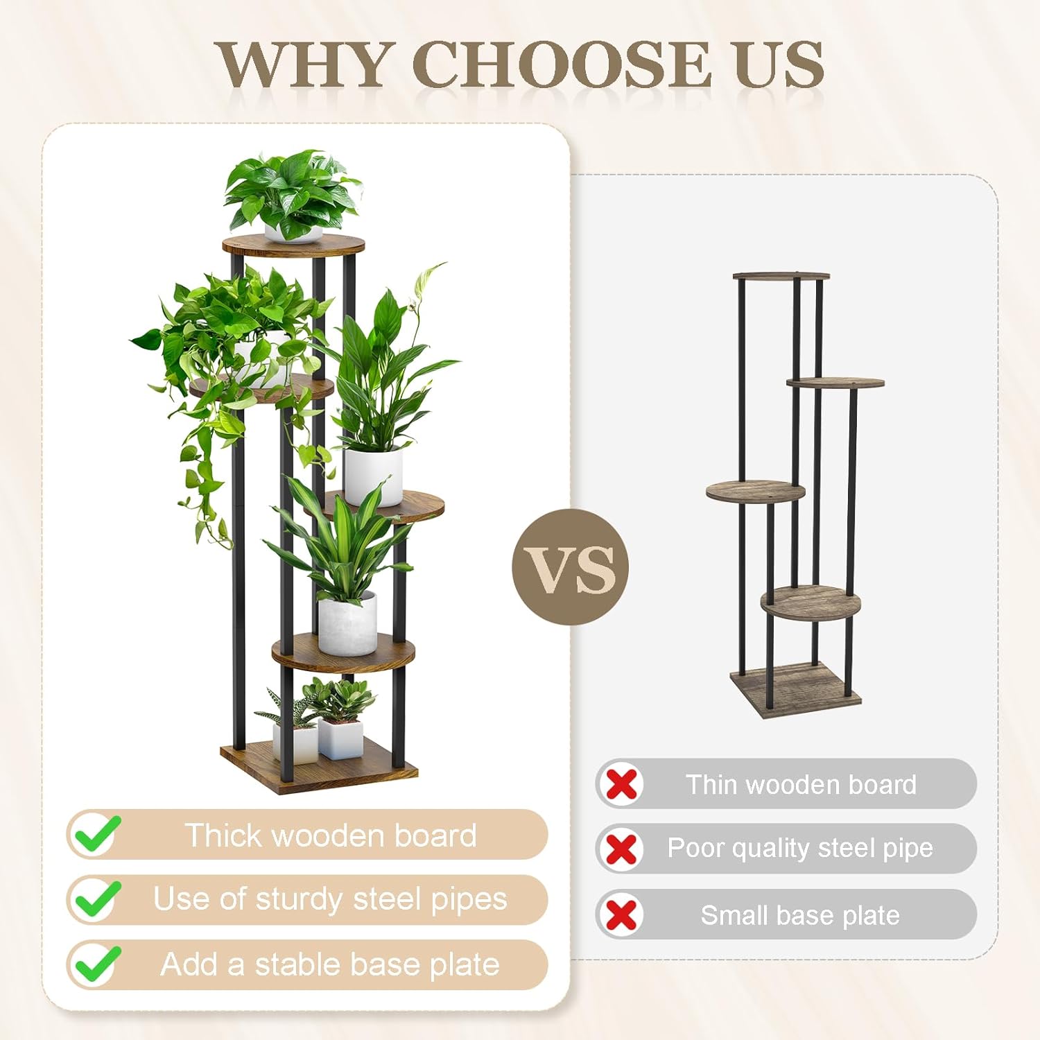 - Sturdy & Stable: Crafted from durable coated wood and reinforced with thick metal brackets, our 4-tier plant shelf can support a variety of potted plants. The thoughtful anti-slip pads further enhance its safety and stability