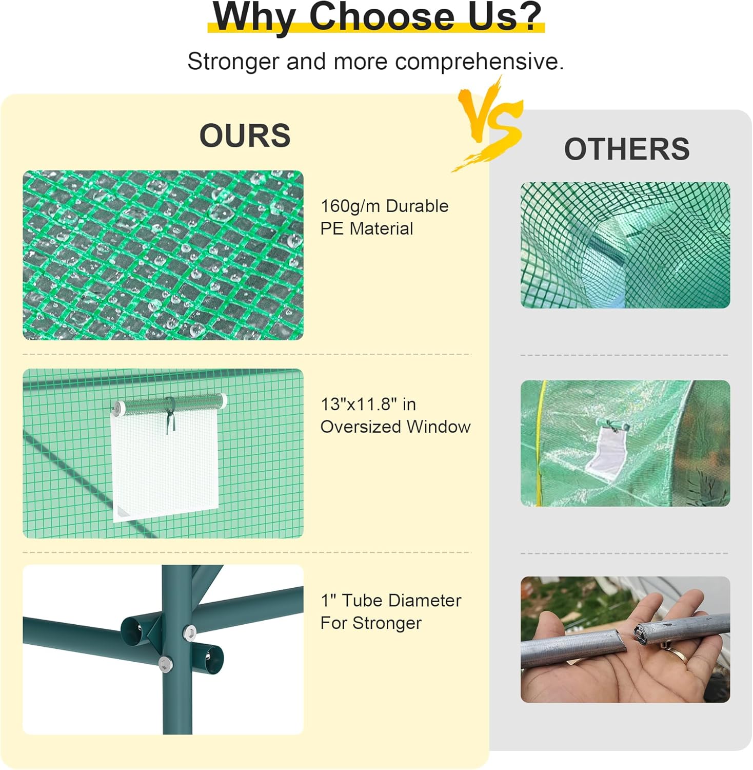 - 【Heavy Duty Galvanized Frame】We have upgraded the load-bearing bar of the warming house, using high quality galvanized material to increase a certain amount of load-bearing; the horizontal bar and 4 diagonal bars greatly improve the stability of the tunnel green house.