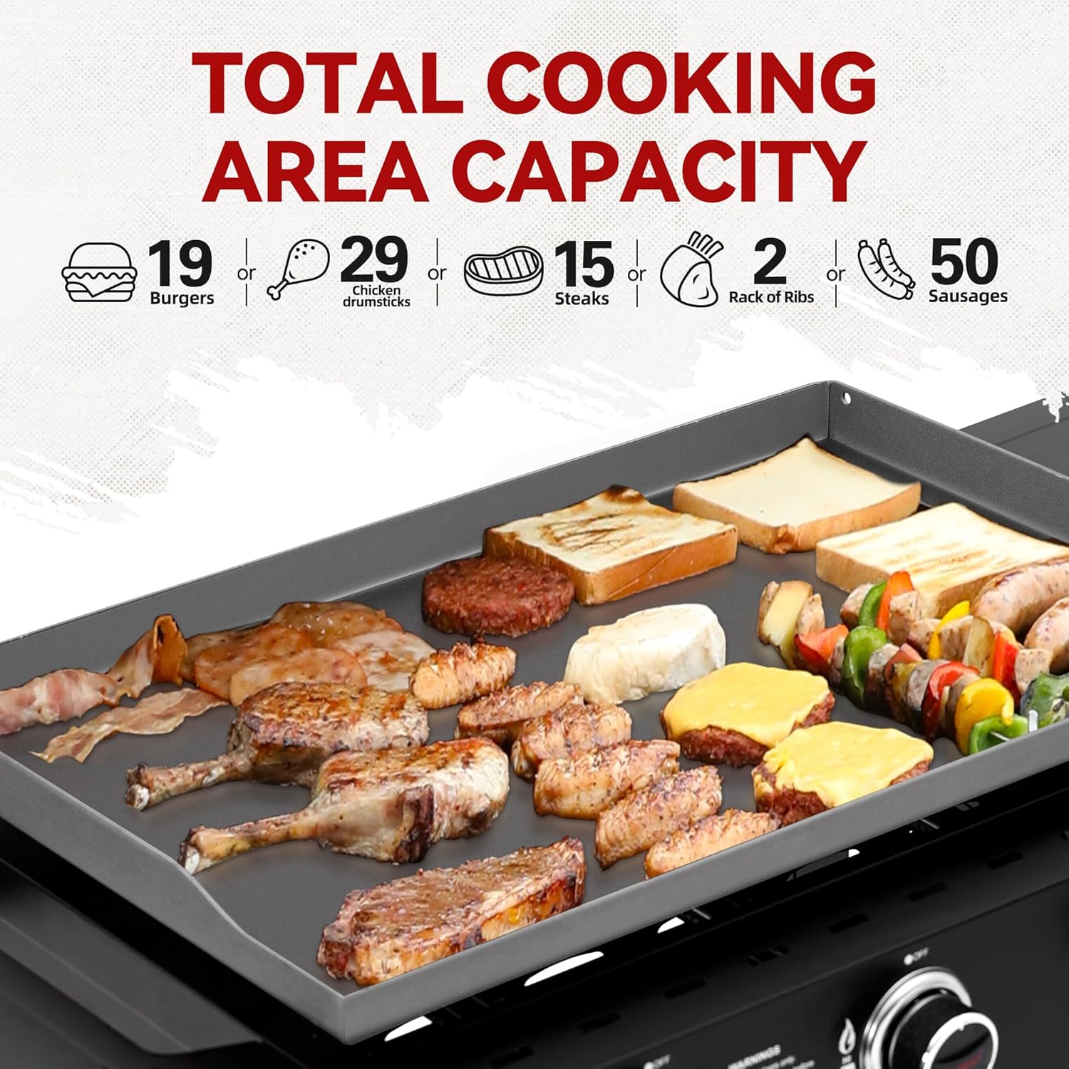 - Spacious Cooking Area: A 3.5mm thick pre-seasoned griddle top offers 492 sq. in. of cooking area, cooking up to 19 burgers at once. This griddle handles a variety of foods simultaneously, catering to diverse cooking needs.