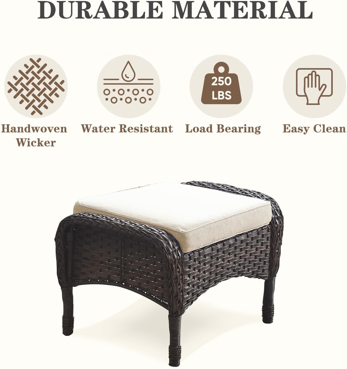- 4.LUXURIOUS OUTDOOR RETREAT ENSEMBLE: Relax in the beautiful outdoors with this perfect 6 pieces patio glider furniture set. Our patio swivel rocker chair set with high quality foam cushion, comfortable and soft rebound good. The cushion cover is made of olefin outdoor water-resistant fabric. The seat and backrest are made of beautifully woven wicker coupled with ergonomic design, making it a classic upgrade for any porch, deck or patio.
