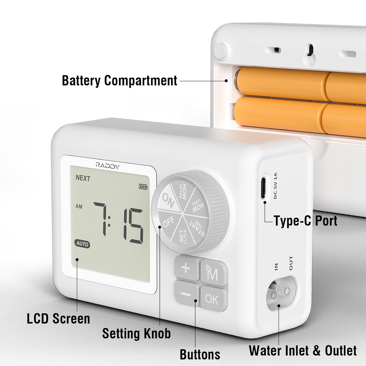 - Easy Installation: The Raddy WS-6 simplifies setup with a complete kit, including an auto water timer, 33-foot 1/4" tubing, check valve, Type-C cable, micro drippers, and various connectors. Simply connect the components, set it up, and let it water your plants automatically