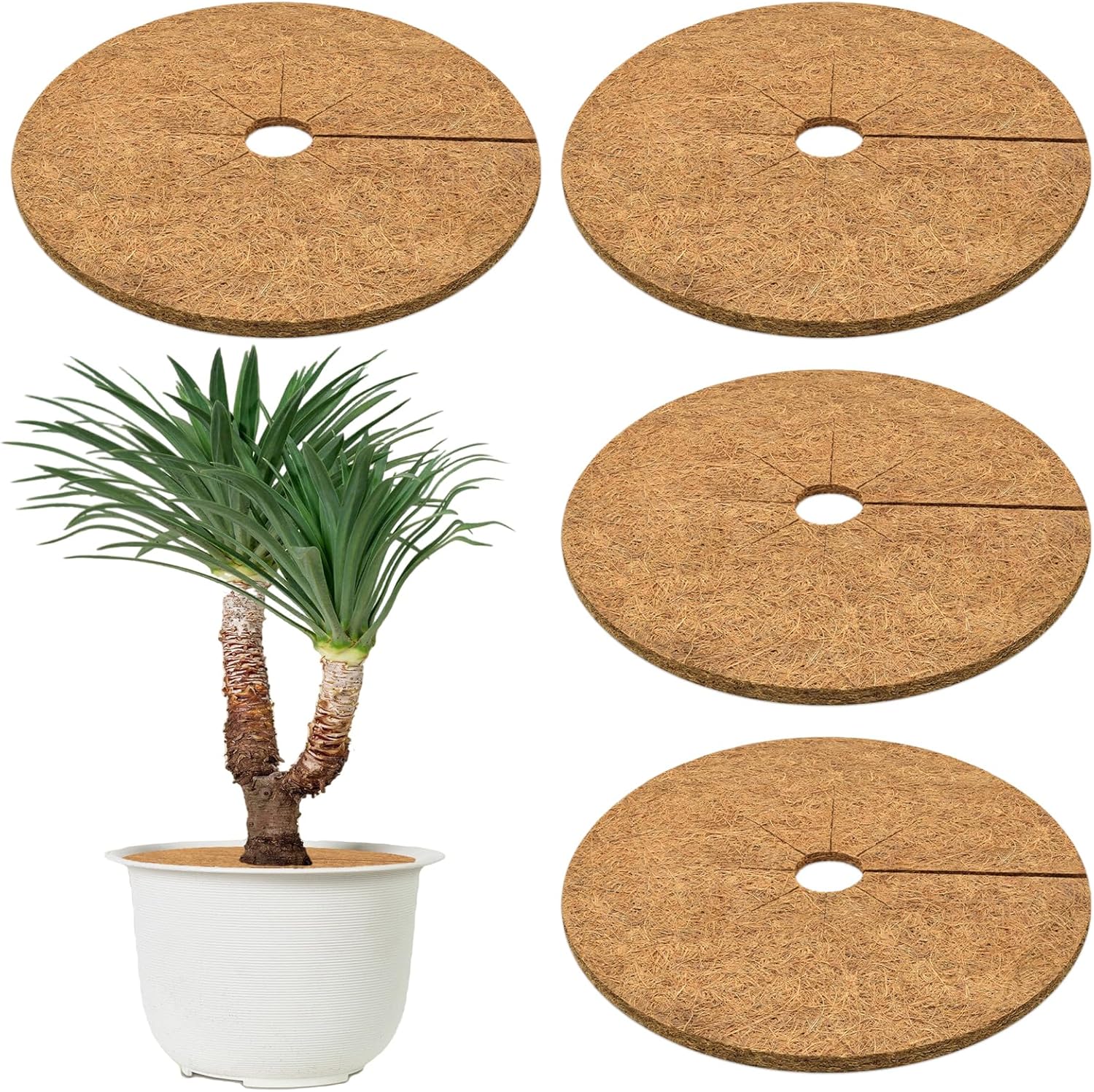 - Coconut Mulch Ring: You will get 4 pcs round coco fiber mat, which are enough for your daily needs, you can use them to keep weeds from growing; Cover them on the roots of small potted plants to look beautiful and tidy