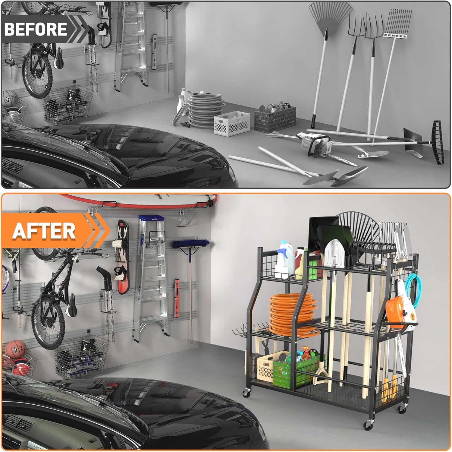 - Maximize Storage with Larger Capacity: With three tiers, this tools organizer holds rakes, shovels, brooms, and more. It has slots for long handles, hooks for small tools, shelves for gardening supplies, giving you ample storage