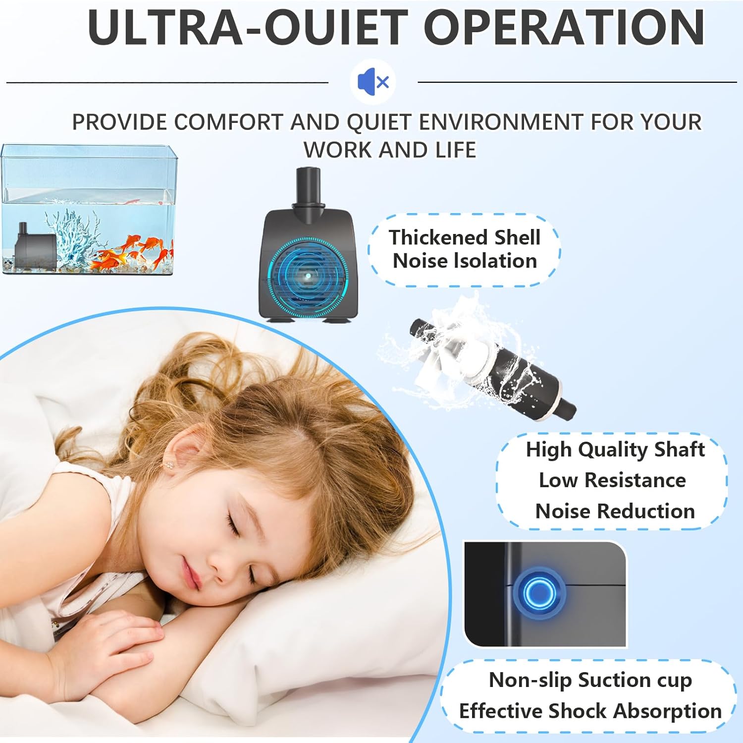 - 【STRONG POWER & QUIET OPERATION】This submersible water pump built-in pure copper motor, more powerful and durable. It’s ultra quiet,running at a ‘whisper’ level, produce no noise, giving you a quiet environment.