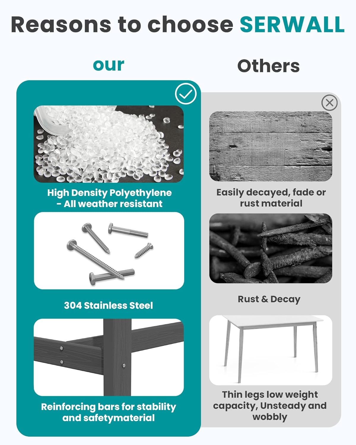 - Sturdy and Durable: Serwall outdoor furniture crafted from recyclable HDPE (High-Density Polyethylene), this material is built to withstand extreme weather conditions, including intense sun, freezing temperatures, strong winds, and heavy rain, all while maintaining its original color.
