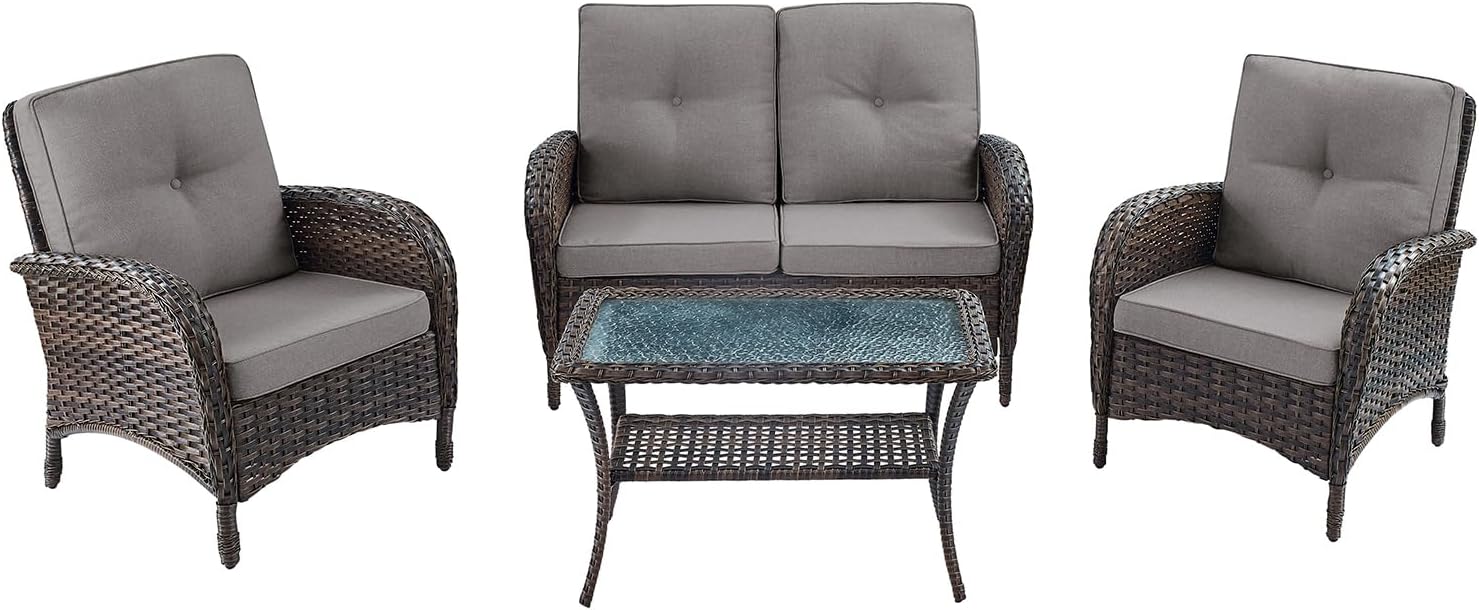 HUMMUH 4-Piece Patio Furniture Wicker Outdoor Conversation Set,All-Weather Rattan Outdoor Sofa Set Patio Chairs Coffee Table for Backyard,Porch,Deck