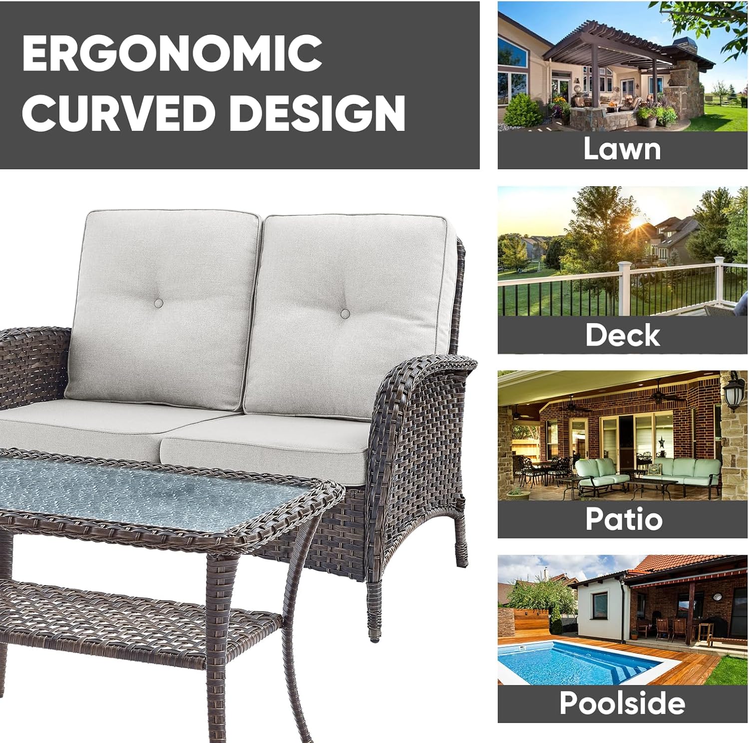 - Ergonomic Design:Added more comfortable support with the ergonomic high backrest and wide armrests design.Deep and wide seats with 4-inch thick sponge-padded cushions.Offers good resilience, not easy to deform or slide,for relaxing lumbar and added comfort and coziness.