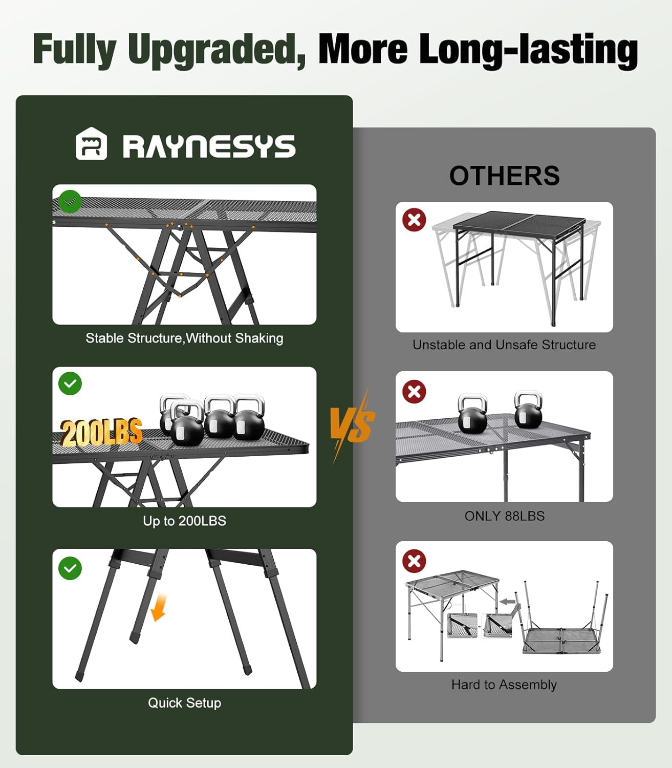 - More Stable Structure: The folding grill table legs come with a hexagonal thickened steel pipe design, compared to the ordinary iron pipe which loads up to 80lbs, will increase the load-bearing area to 200lbs, and the 4 sides with a triangle and latches support point, the stability achieves to the maximum point.