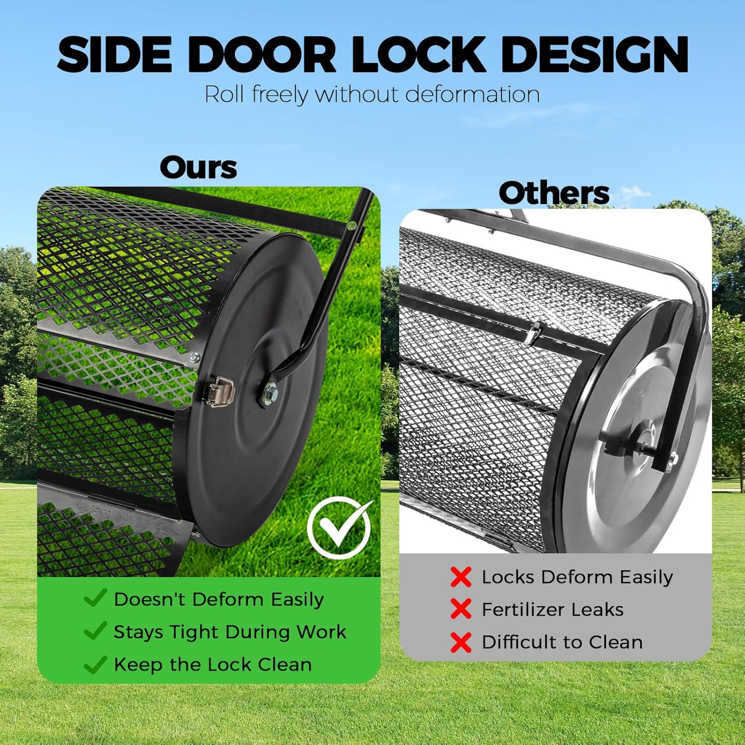 - Easy to Operate: The peat moss spreader is equipped with an upgraded hinge design that allows for a wider opening angle. The hinged soil roller door makes filling easy, while the lawn soil spreader side clasps secure the load