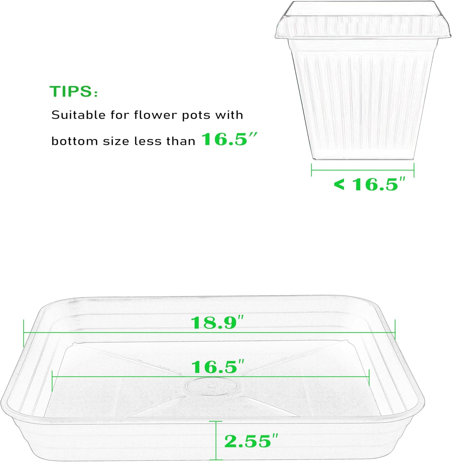 - Plant Trays For Pots: This 18 inch Square trays have certain value of use both indoors and outdoors. Square plant saucer can be placed at the bottom of flower pots to catch the excess water that drains out when watering, thus keeping the floor clean.