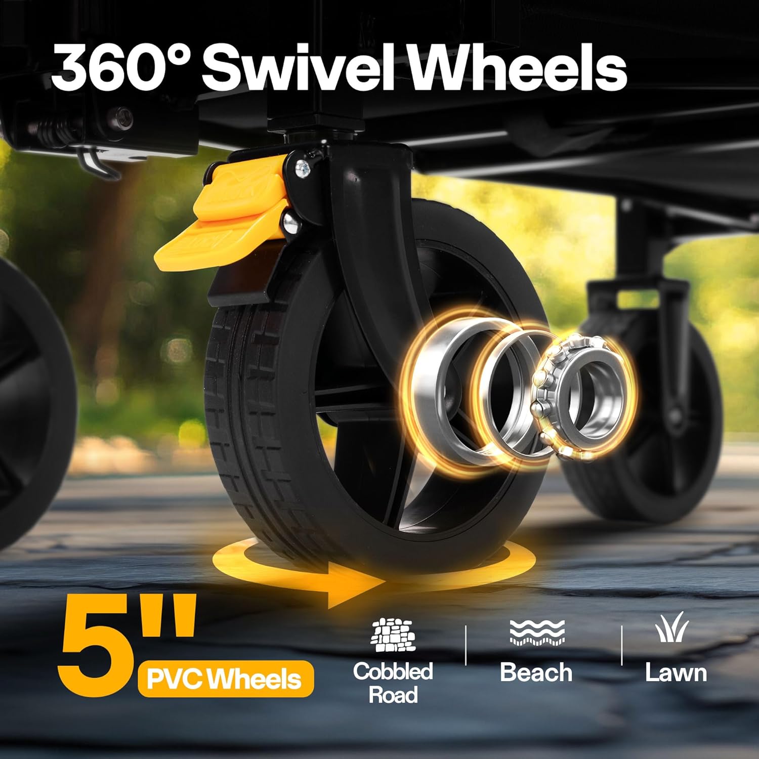 - 360ยฐ SWIVEL WHEEL: This collapsible wagon is equipped with four 5-inch PVC all-terrain wheels designed to handle hard sand, grass, and uneven surfaces; The rear wheels include brakes for added stability when parked on slopes; Perfect for gardening tasks like hauling various flowers, fertilizers, and gardening supplies with ease