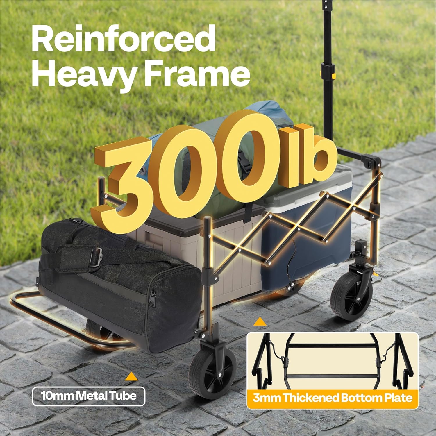 - SOLID FRAME CONSTRUCTION: The heavy-duty metal frame ensures superior durability, strength, stability, and weather resistance, supporting up to 300 lb; Made of 600D Oxford fabric, the wagon is waterproof, tear-resistant, and durable; It also includes 2 built-in cup holders to keep your drinks within easy reach