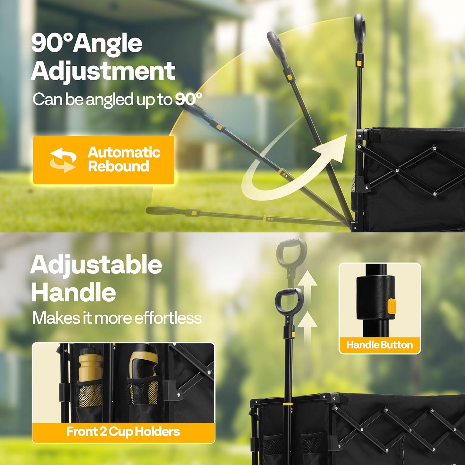 - FLEXIBLE HANDLE: The adjustable handle can be angled up to 90ยฐ in both upward and downward directions; With its extended adjustable handle, the wagon can be easily maneuvered even when carrying heavy loads, ensuring a smooth and effortless pulling experience