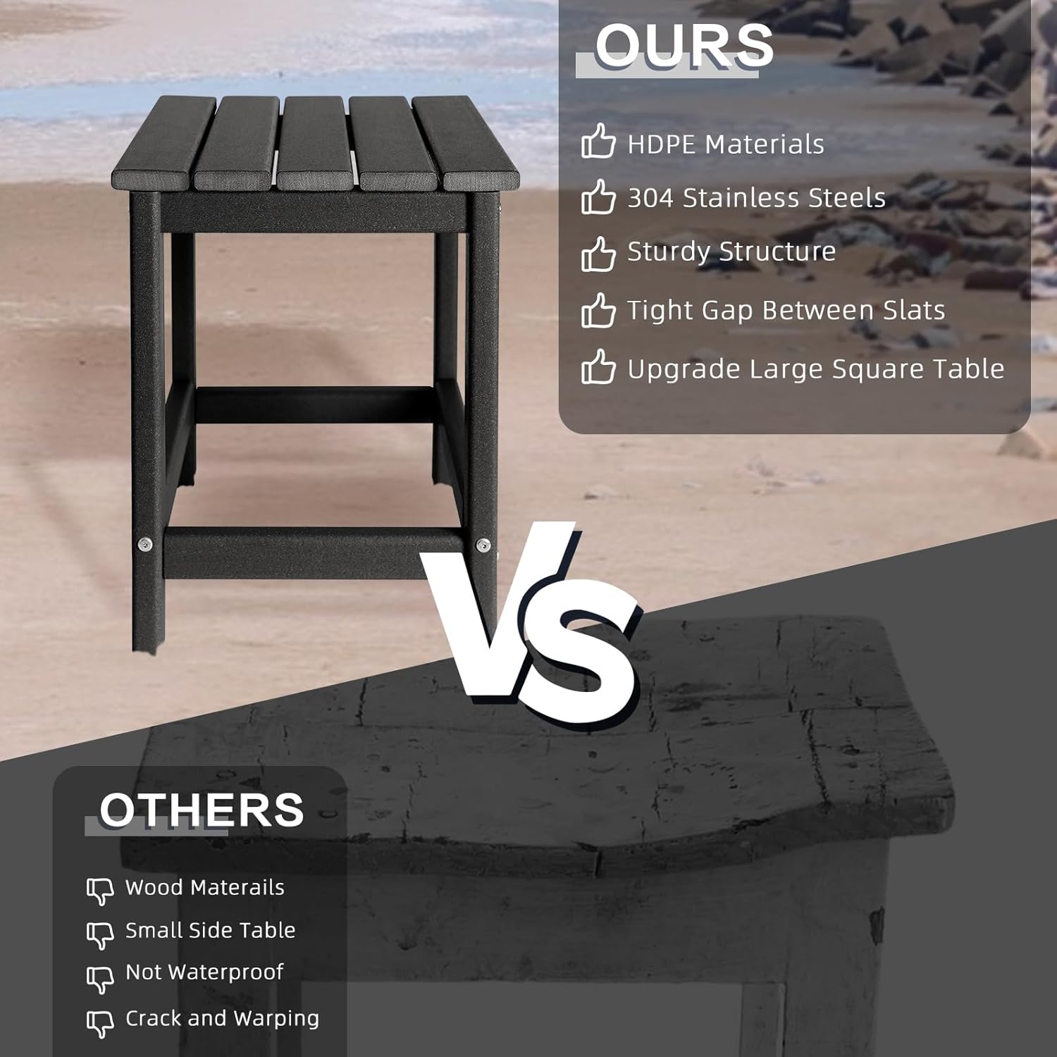 - 【Durable and Waterproof】Our small outdoor side table is made of recycled plastic HDPE. This material prevents warping, dents, rot and fading, perfectly improving the shortcomings of solid wood that is prone to rot, mold, chipping, peeling and cracking. The slat of outdoor end tables design allows for effective drainage, keeping it dry even in wet conditions. The adirondack side table outdoor is rust-proof, durable and has a long service life.
