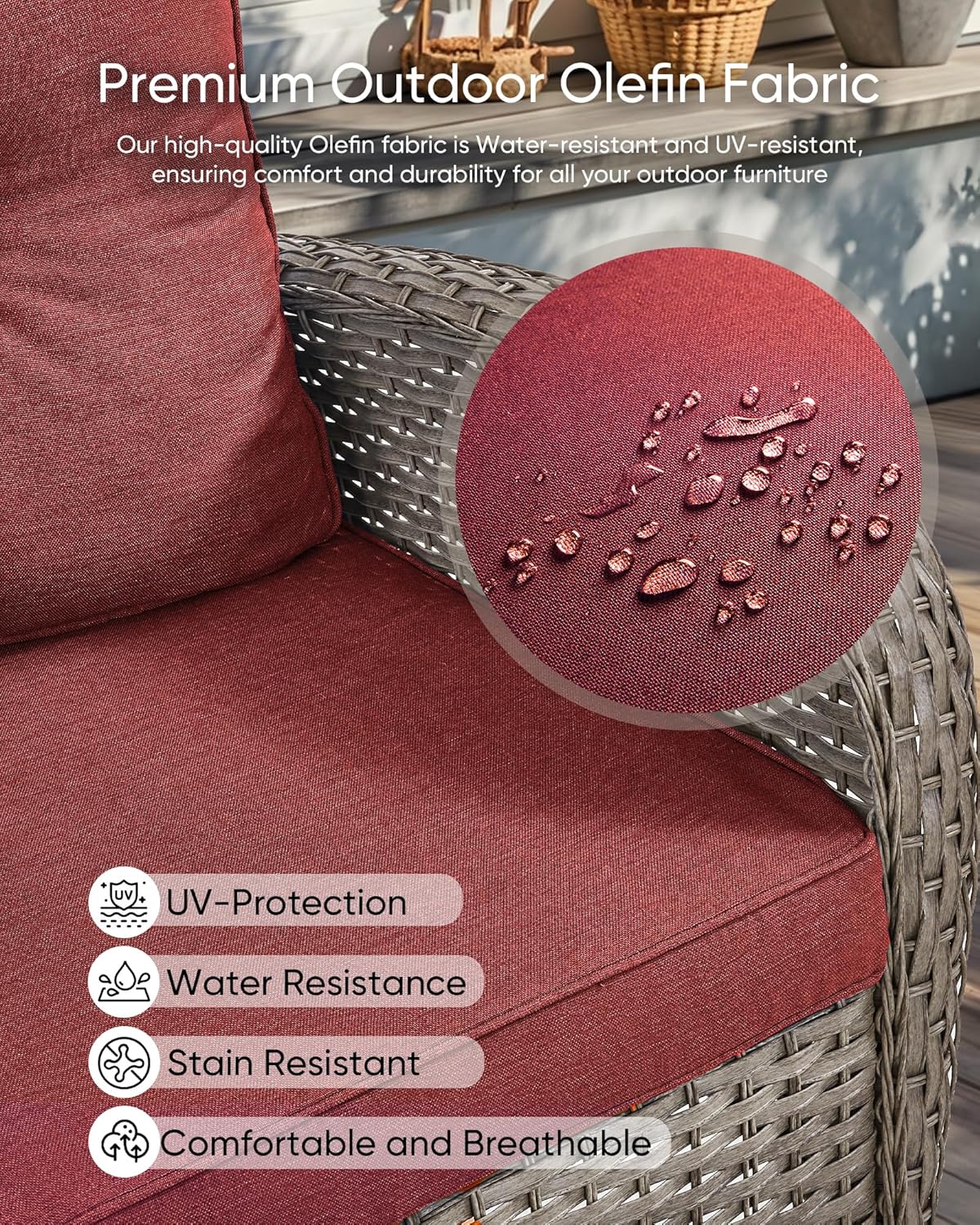 - Weather-Resistant Olefin Fabric for Outdoor Furniture: These outdoor cushions are made with premium olefin fabric, known for its breathability and durability. Water-resistant, fade-resistant, and UV-protected, they’re designed to withstand the elements. The fabric’s waterproof layer helps repel spills like coffee or wine, allowing for a quick wipe-down. With removable covers for easy cleaning, these cushions stay comfortable and fresh, providing lasting support and style for your outdoor space.