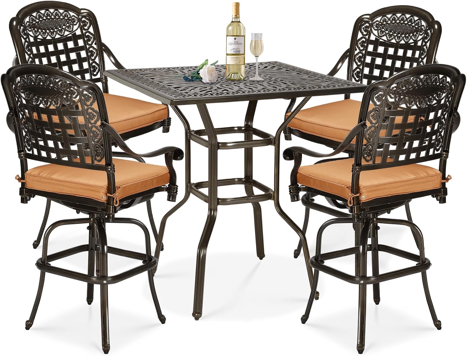 5 Pieces Patio Swivel Bar Set, Patio Bar Table and Chairs Set, All-Weather Cast Aluminum Outdoor Swivel Bar Stools of 4 and 35.4" Square Bar Table, High Top Bistro Set for Deck, Pool, Garden