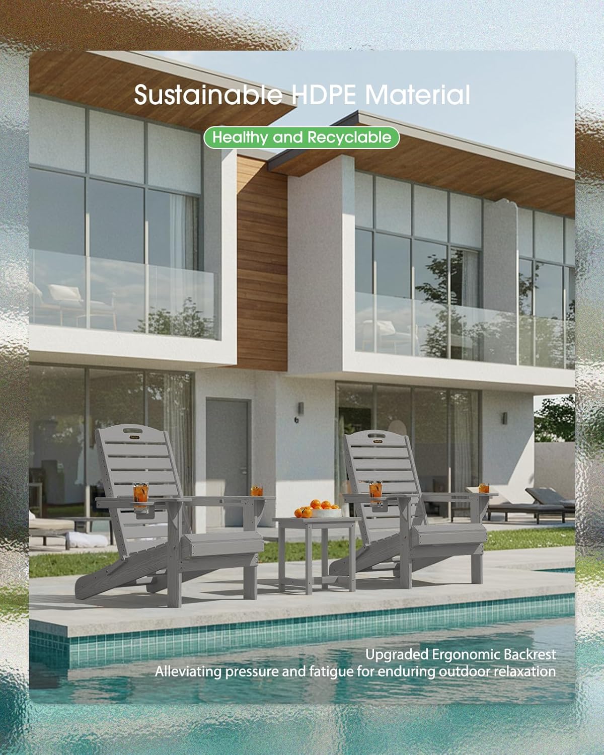 Adirondack Chairs Set of 2, Outdoor Fire Pit Chairs, HDPE All-Weather Adirondack Chairs with Cup Holder, Lawn Chair for Deck, Patio, Garden (Grey)