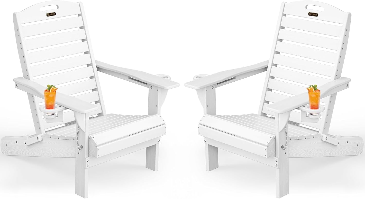 Adirondack Chairs Set of 2, Outdoor Fire Pit Chairs, HDPE All-Weather Adirondack Chairs with Cup Holder, Lawn Chair for Deck, Patio, Garden (White)