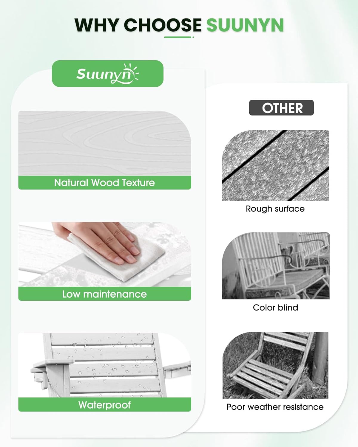 - Weather-Resistant: Made of high-quality HDPE material with wooden texture, SUUNYN sturdy adirondack chair offers excellent weather resistance, resisting fading, splitting, cracking, chipping, peeling, and rotting in harsh conditions. Plus, its easy-to-clean surface and low maintenance