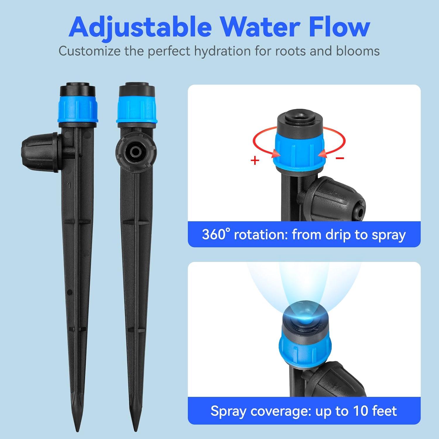 - Adjustable Drip Emitter Vortex: The drip irrigation emitters' spraying radius can be adjusted turning the cap,allow your plants to receive proper watering according to their needs.These drip irrigation emitters can be disassembled for easy cleaning