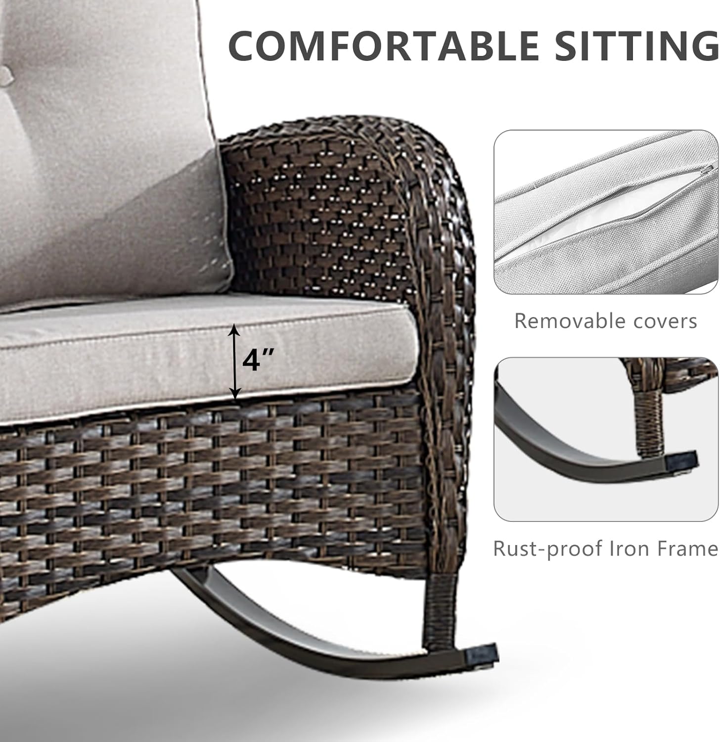 HUMMUH 5 Pieces Wicker Patio Furniture Set,Outdoor Rocker Chairs,Patio Ottomans,Glass Top Side Table,Outdoor Conversation Set for Porch Deck Backyard Poolside