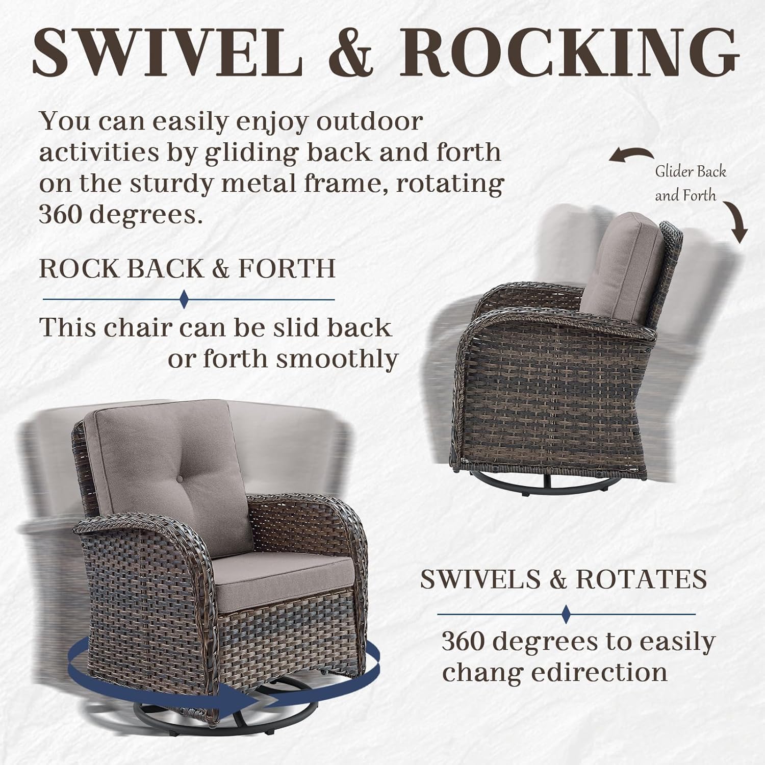 - Swivel Rocking Chairs:Resting on chairs with sturdy round metal base allows to glide gently and swivel 360Β° for relaxing, with seat and back cushions contribute to comfortable support, making the outdoor set a perfect addition to transform your patio.