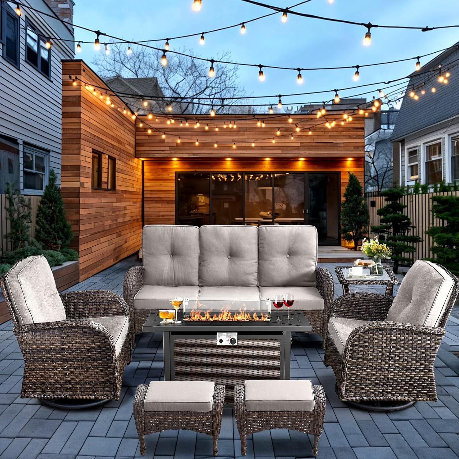 HUMMUH 7-Piece Patio Furniture Set with Fire Pit,Wicker Patio Sofa Set Outdoor Swivel Rocking Chairs with Ottomans for Backyard,Poolside,Deck