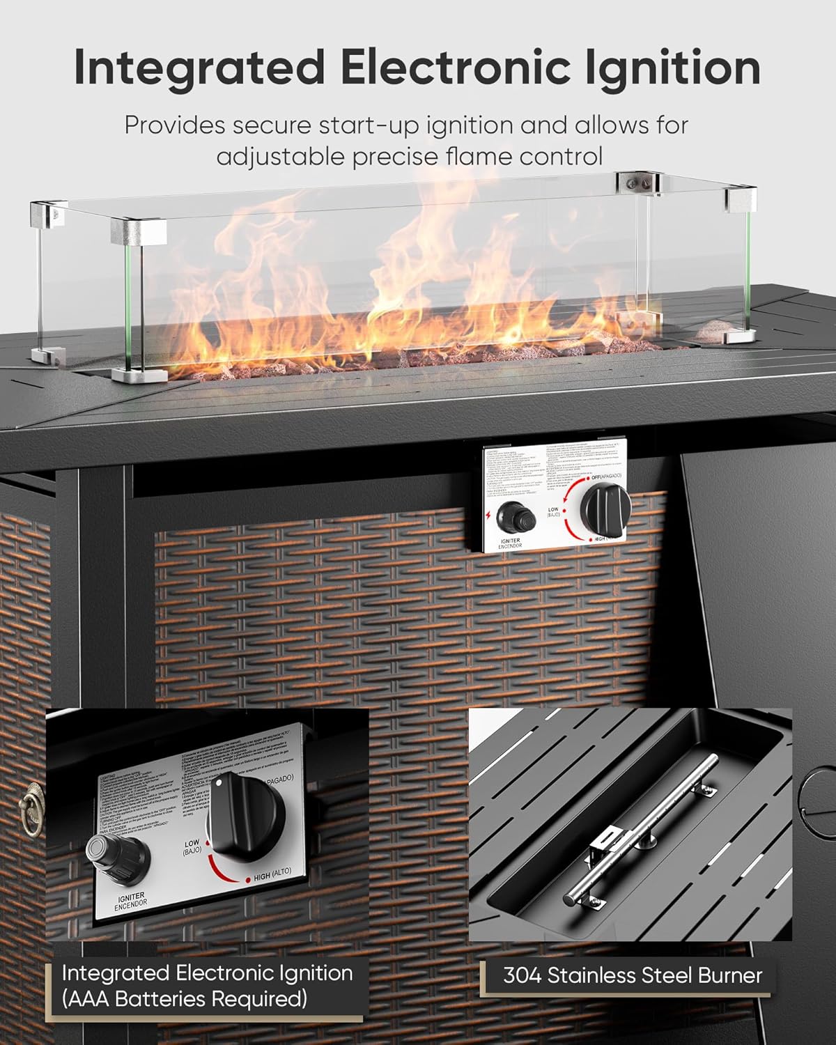 - Warm Bonfire and Auto-ignition Device:The gas fire pit table has a heat output of 50,000 BTUs and is equipped with an integrated electronic ignition that adjusts the flame to your desired temperature with the control button. Continuously provide you with enough warmth.
