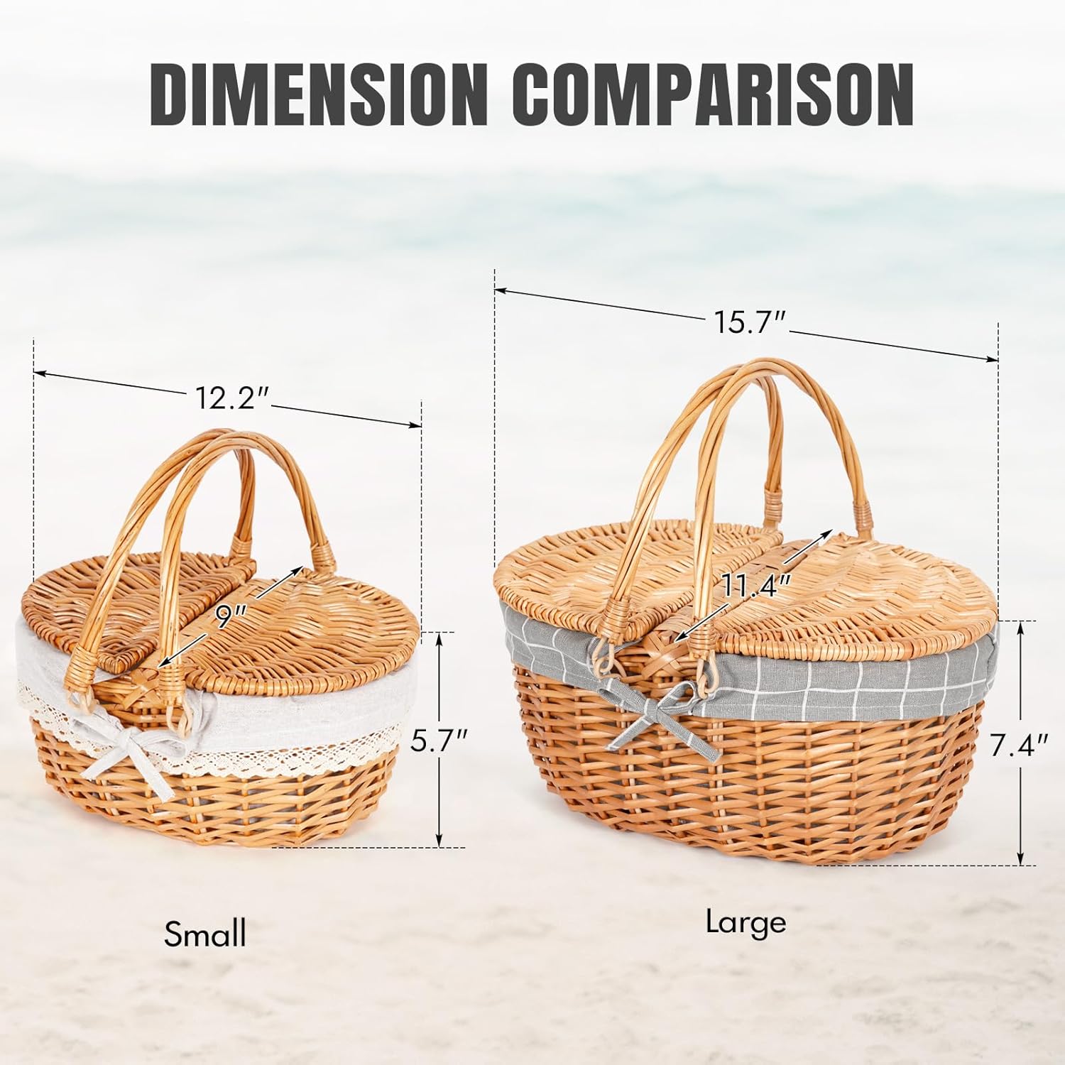 - 【LARGE PICNIC BASKET】: This double handles basket 15.7" x 11.4" x 7.4" , wicker picnic basket is big enough to fit two people out for a picnic and is very sturdy! Vintage style is perfect for picnics on the beach, parks, meadows, sandy beaches