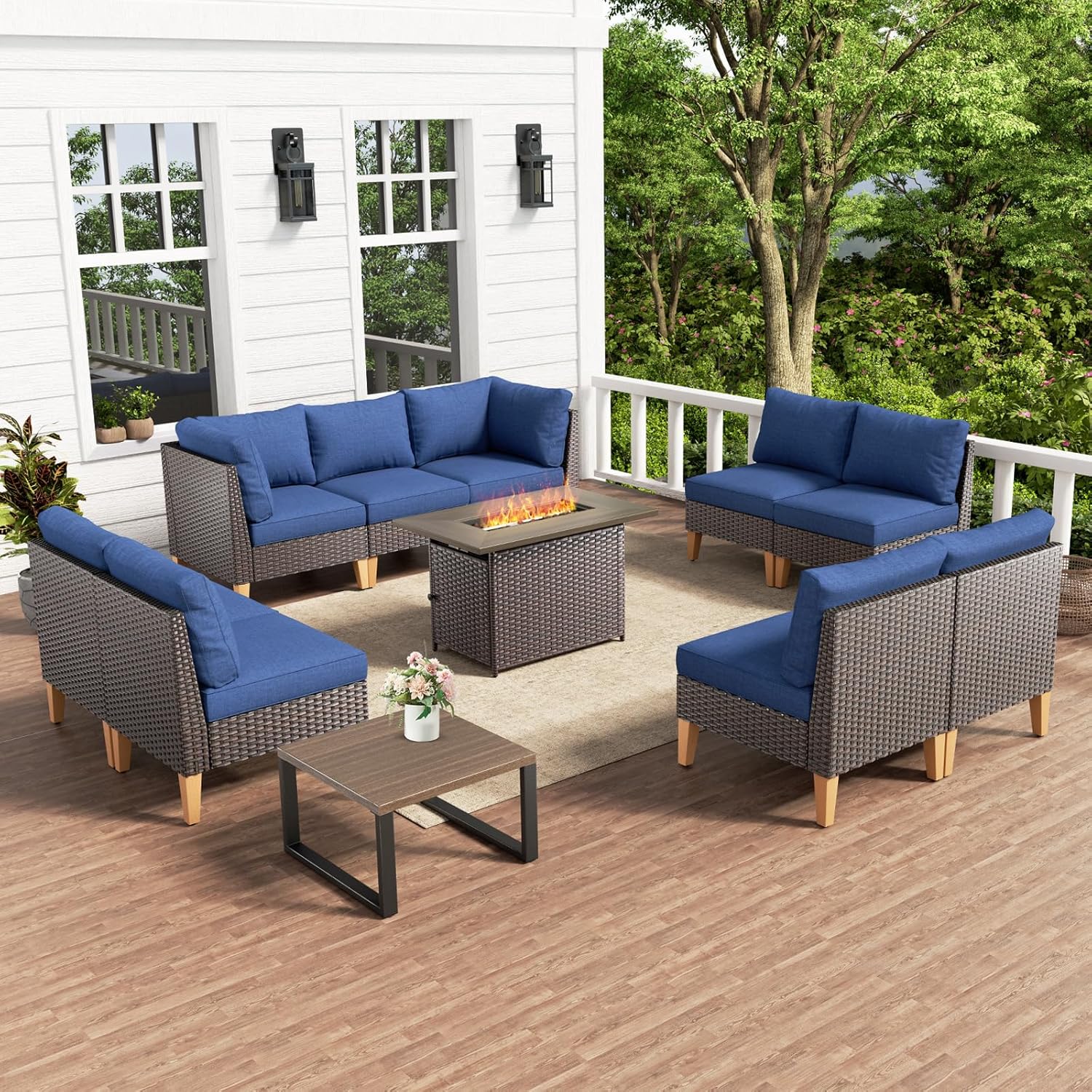 HUMMUH 11 Pieces Patio Furniture Set with Fire Pit,Outdoor Modular Sectional Couch Loveseat Chairs with Table,All Weather PE Wicker Patio Conversation Sets for Deck Porch Backyard