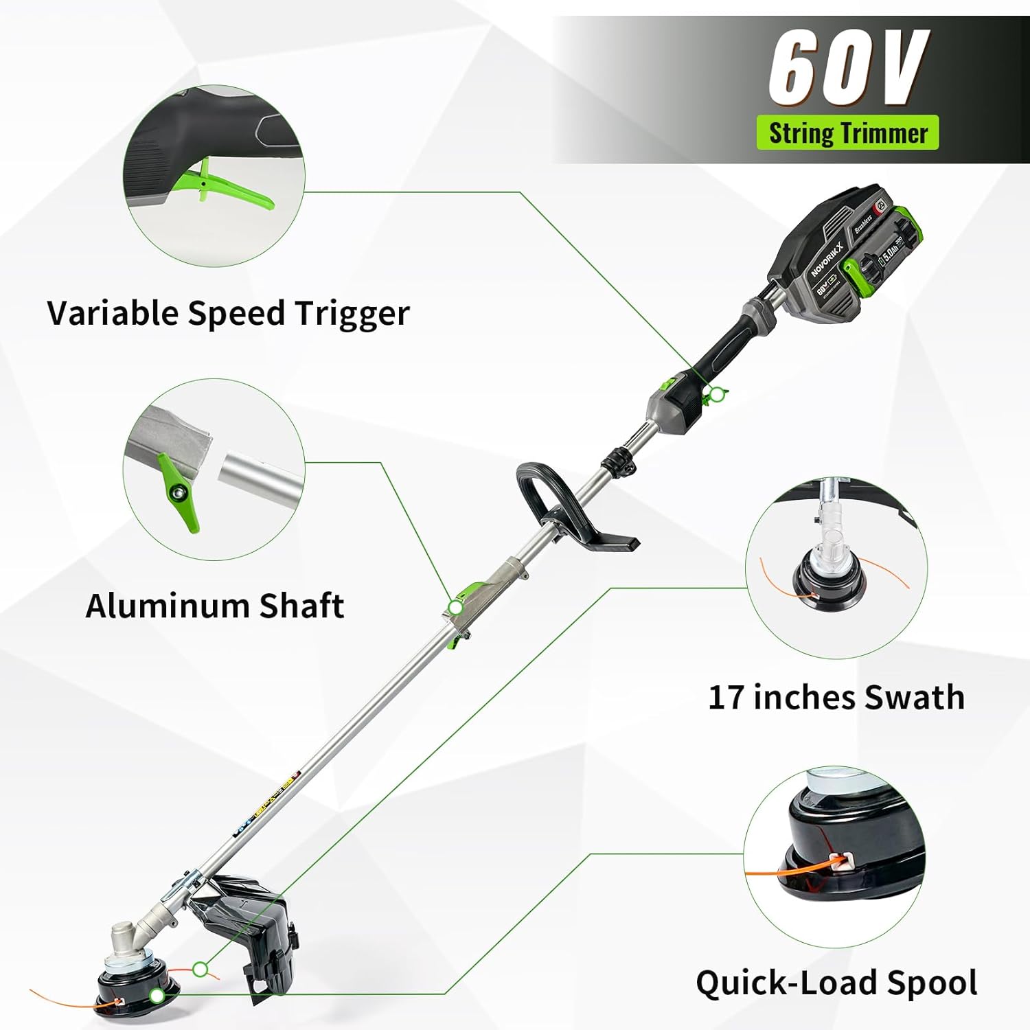 60V Lithium Ion Cordless String Trimmer, 17 Inch Two Speed Brushless String Trimmer with 5.0Ah Battery and Charger