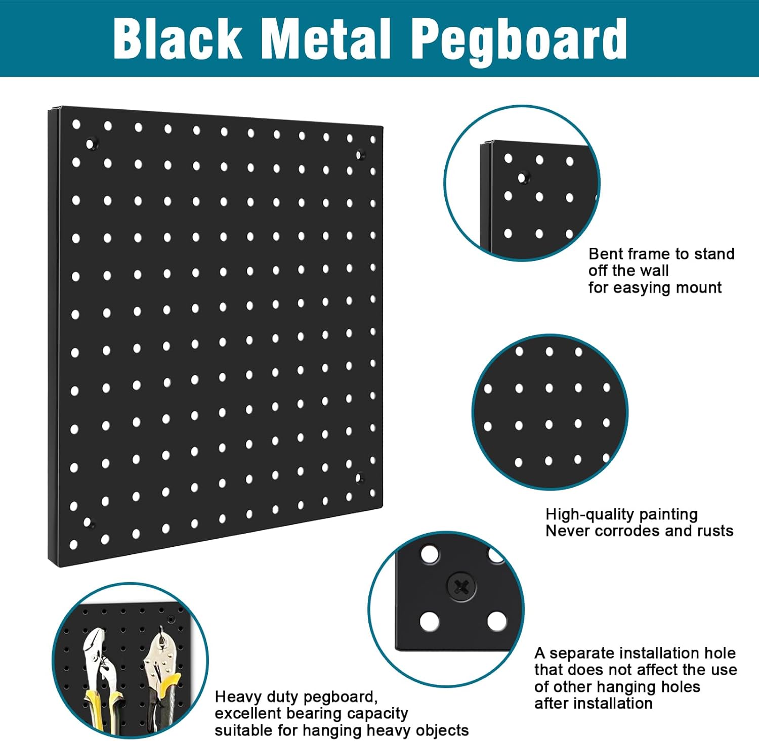 Peg Board,Steel Organization Panels, Ideal for Garage Tool Storage, Office Organization, Craft Room, Kitchen,Pack of 4 (Black, 4-12X12)