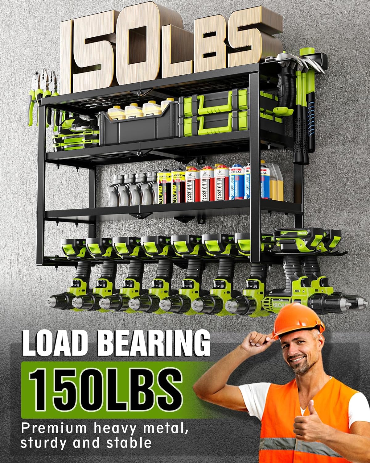 - LOAD BEARING 150 LBS: Our tool organizer is made of premium heavy metal, featuring durability, pressure resistance. It comes with 8 wall anchors to make the rack more sturdy and stable. After extensive load testing, each layer can support up to 37 LBS