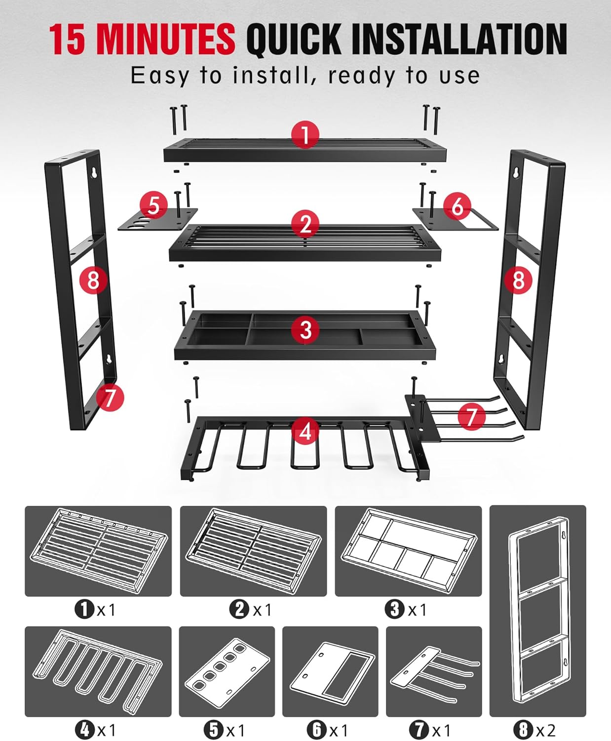 - LOAD BEARING 150 LBS: Our tool organizer is made of premium heavy metal, featuring durability, pressure resistance. It comes with 8 wall anchors to make the rack more sturdy and stable. After extensive load testing, each layer can support up to 37 LBS