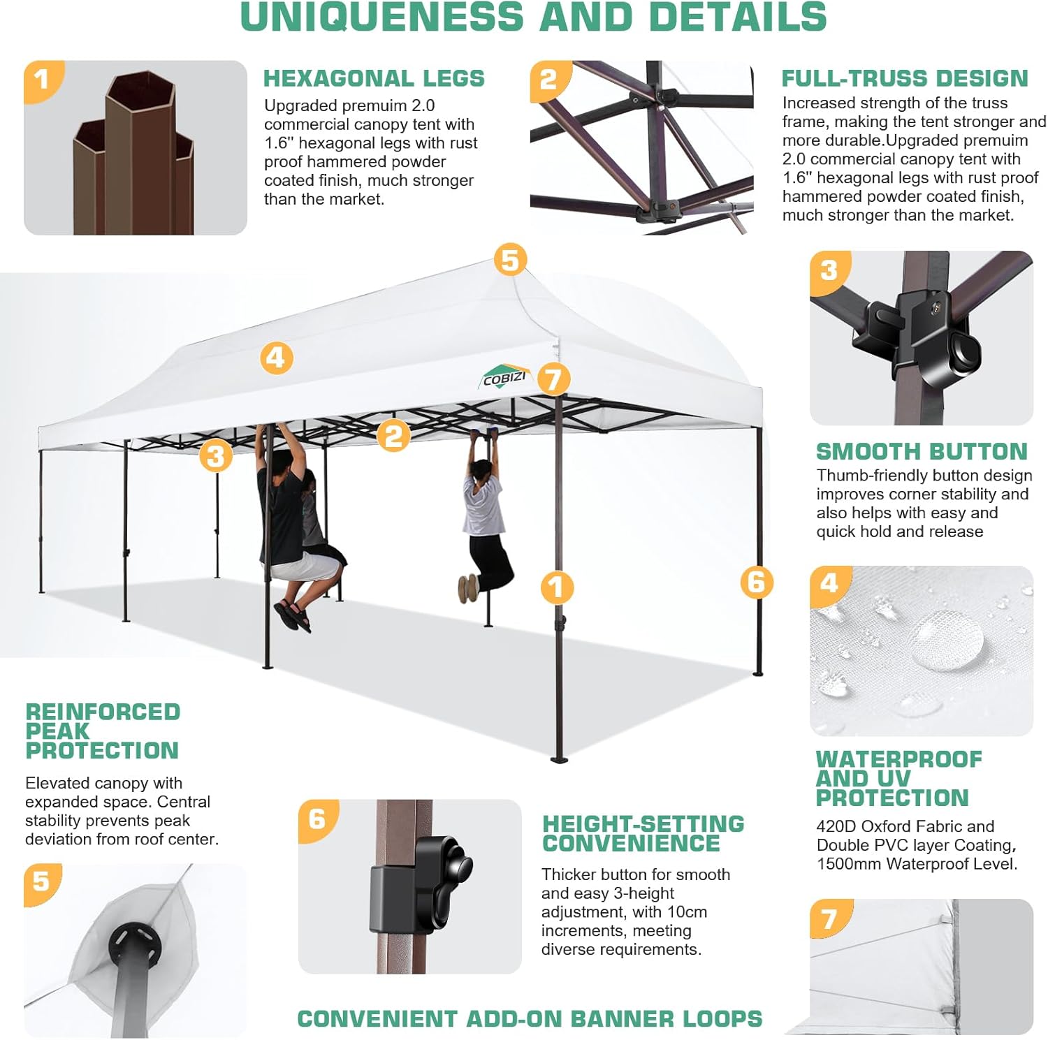 - 【Upgrade Heavy Duty Canopy】 The COBIZI 10x30 Heavy Duty Pop up Canopy features a commercial-grade full truss structure constructed from durable powder-coated stainless steel. The thickness of the 1.7 inch (45mm) hexagonal legs has been increased to 0.7mm/0.03 inches, providing superior stability and durability. Full truss design ensures exceptional sturdiness and rust resistance, capable of withstanding wind speeds of up to 30mph when properly secured with an number of ropes, and stakes.