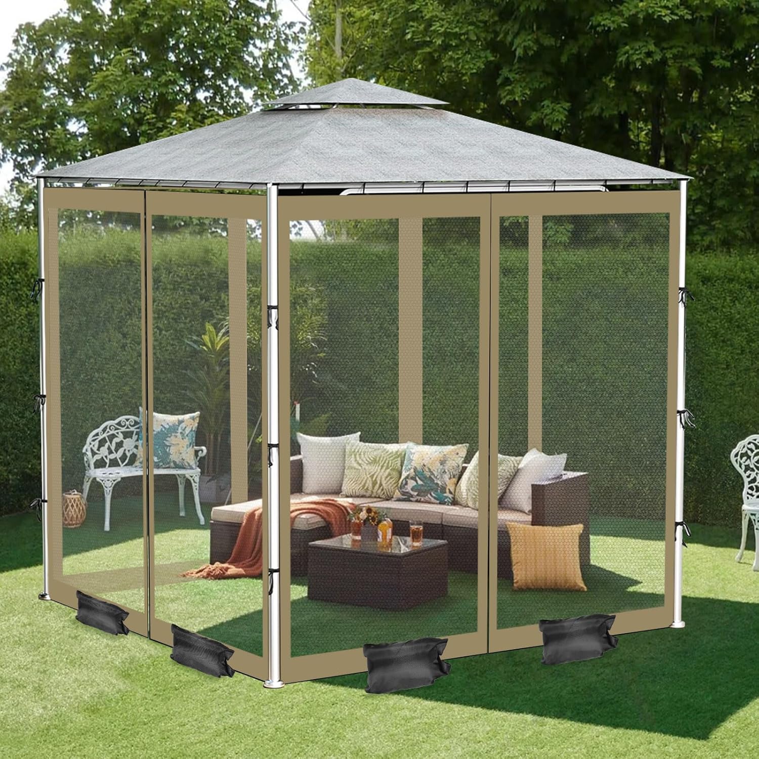 - đď¸ăPerfect Fit & Extra Stabilityă Fits 10x10ft Gazebos â Measures 10ft (L) x 10ft (W) x 7.2ft (H) with 4 zippered panels for full coverage. Includes 8 sandbags (competitors donât offer!) to prevent wind lift-offâno more flying mesh! Always measure your gazebo before purchase.